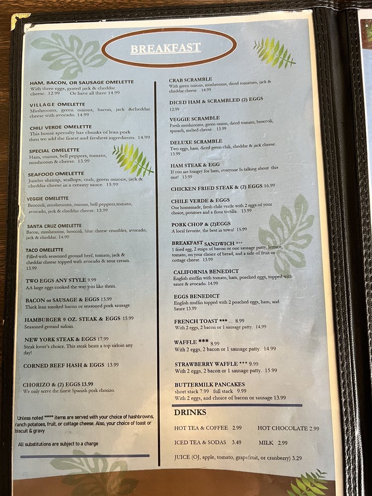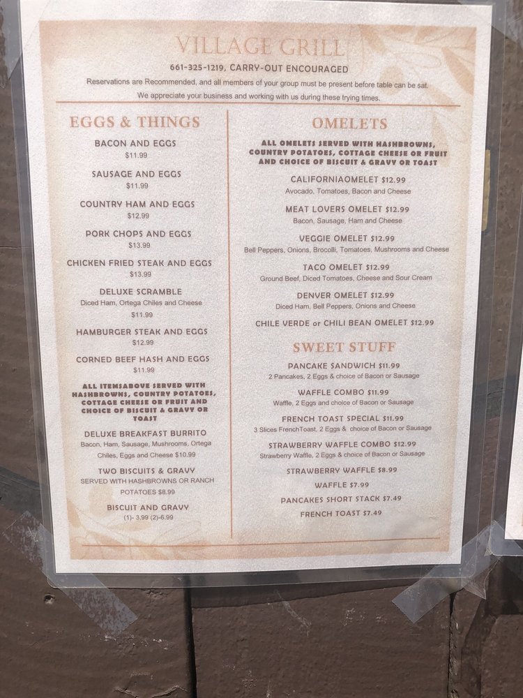 Welcome to Village Grill, the charming gem in Bakersfield, California, where breakfast and brunch take on a delightful twist. Nestled at 2805 F St, this eatery offers a diverse menu that caters to every palate, featuring generous portions of delicious dishes. Whether you're craving the comforting French Toast or the savory Chili Omelette, you’ll find flavors that ignite the taste buds.